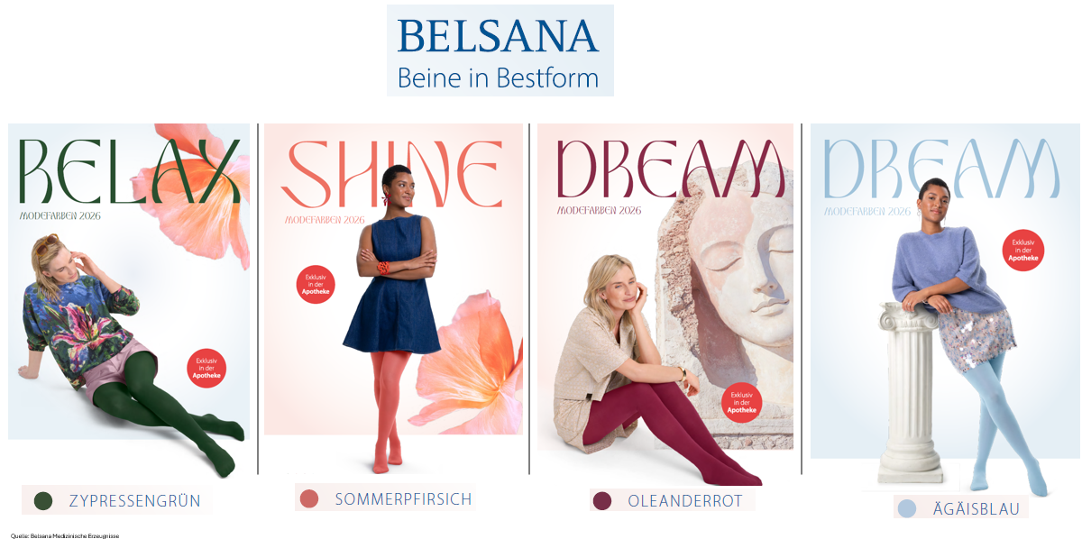 Modefarben 2026 Zypressengrün, Sommerpfirsich, Oleanderrot, Ägäisblau. Bestellbar ab 2. Februar für die Kompressionsstrümpfe BELSANA microsoft und BELSANA vivere sowie den kompressiven Strumpf BELSANA work.